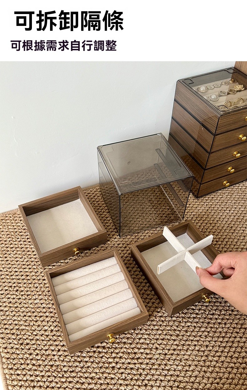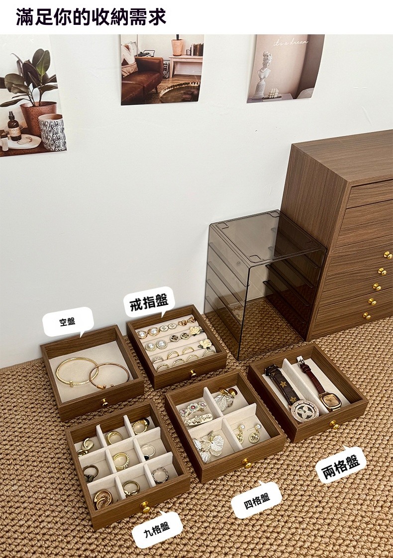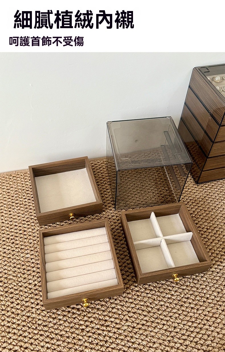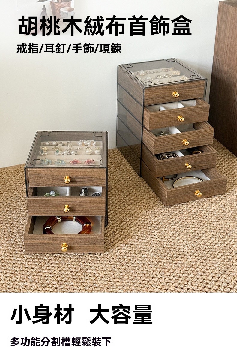小身材大容量!「胡桃木絨布首飾盒」多功能分區收納~戒指、耳環一目了然,妝台質感瞬間升級